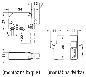 Mechanismus na otevírání dvířek bez použití úchytek. Dvířka jsou v zavřené poloze zachycena háčkem, stiskem se otevřou. Ke kování lze dokoupit náhradní protikus (háček) z bílého plastu 165458, který je v této sadě součástí.