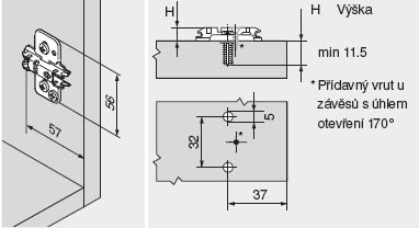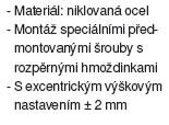 Upevnění: EXPANDO (předmont. spec. šrouby s rozpěrnými hmoždinkami) Vzdálenost mezi upevňovacími pozicemi: 32 mm. Vzdálenost přední hrany korpusu k 1.upevňovacímu otvoru: 37 mm. Průměr upevňovacích otvorů: 5 mm. Hloubka upevňovacích otvorů: 11.5 mm. Výškové seřízení montážní podložky: S excentrem