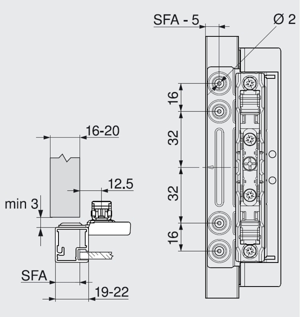 Čelní kování pro úzký alu rámeček (19-22mm) k našroubování. Pro mezer\y na strabě 1-3mm, sílu boků 16-20mm. Použijte doraz z výškou 3mm, NELZE KOMBINOVAT SE SERVO DRIVE!
