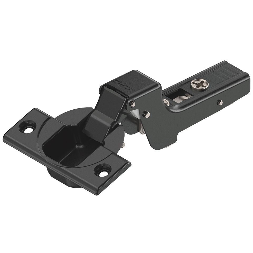 Vložený závěs bez pružiny pro Tip-on. Úhel otevření 110°. Montáž misky na vrut. Barva černá Onyx.