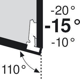 Úhlový závěs -15°. Úhel otevření 110°. Tlumič dorazu BLUMOTION k zavrtání na straně závěsu 970A1002 - 12398. základní podložky: ostatní viz. katalog Blum vrut 173L6130 - 12304, euro 173L8130 - 12305, štelování excentrem 173H7100 - 12340, expando 174E6130.01 - 12303. Pro vloženou variantu nutno použít podložku o 18mm zvýšenou 175H7190.22 - 12311.