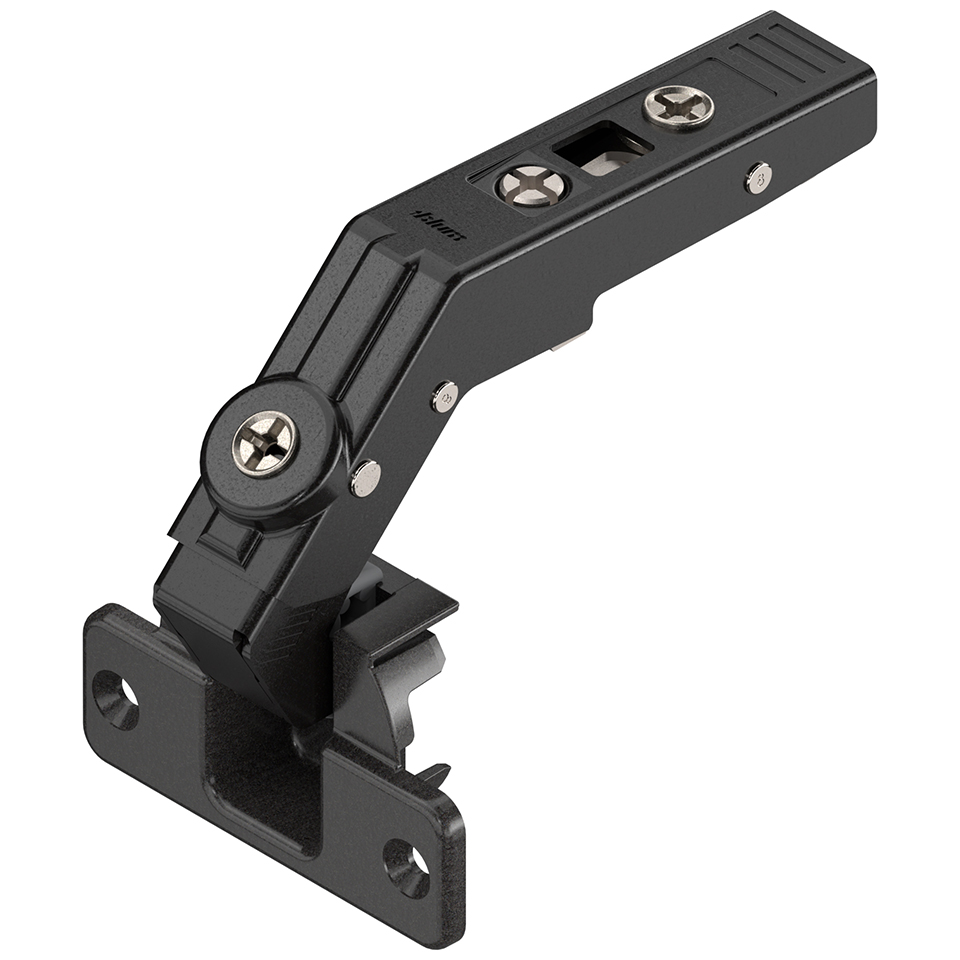 Závěs pro skládané dveře rohové skříňky. Úhel otevření 60°. Montáž misky na vrut. Barva černá Onyx.