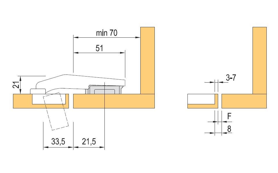 Vložený závěs pro konstrukce se slepým úhlem - dvířka v rovině s lubem. Funkce závěsu (Tip-on, Clip-top, Blumotion), způsob upevnění misky a barevné provedení viz název produktu. Závěsy Clip-top (bez tlumení) možno dovybavit externím zavrtaným tlumičem.