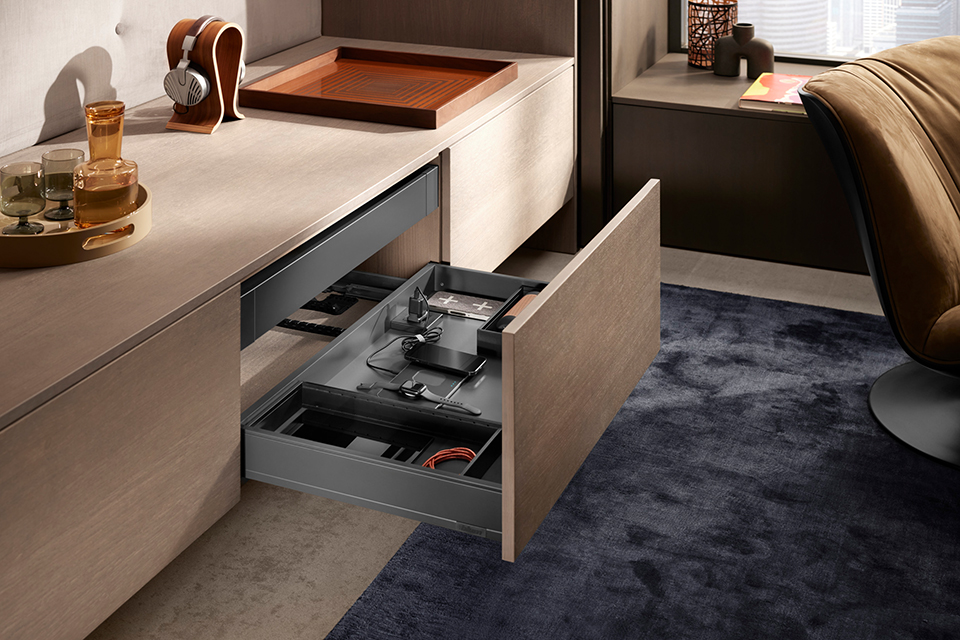 Amperos AC lze snadno integrovat do systému výsuvů Movento a Legrabox a dokonale kombinovat s řešením Blumotion, Tip-on Blumotion a Servo-drive.