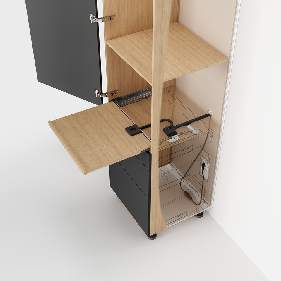 Se systémem Amperos AC se do skříňky pro spotřebiče s policovým výsuvem bez problémů vejdou i větší a těžší přístroje. Zásuvka je z důvodu úspory místa umístěna v zadní části výsuvu. Tím se otevírají chytré možnosti integrace, ať už do pracovního, obývacího, nebo kuchyňského nábytku.