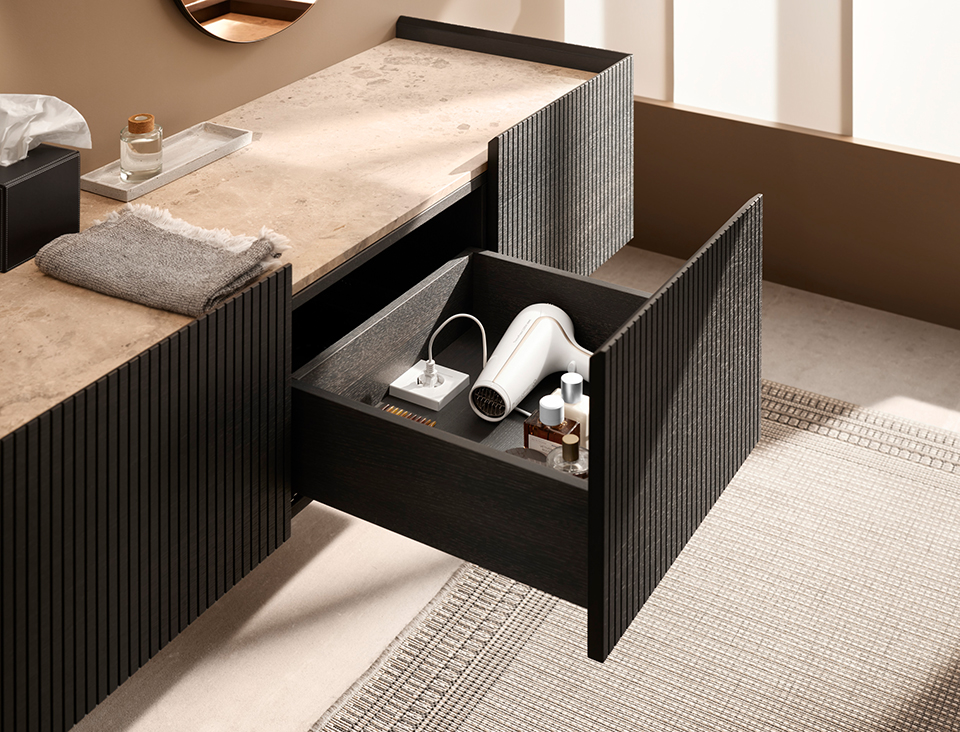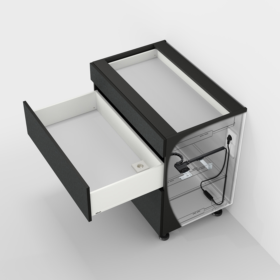 Amperos AC je elegantní a praktické řešení pro napájení elektrických spotřebičů v nábytku. Díky vestavěné zásuvce lze elektrické spotřebiče snadno schovat do zásuvek nebo policových výsuvů, aniž by docházelo k plýtvání místem. Pracovní plochy tak zůstávají volné a obvyklá změť kabelů je minulostí.