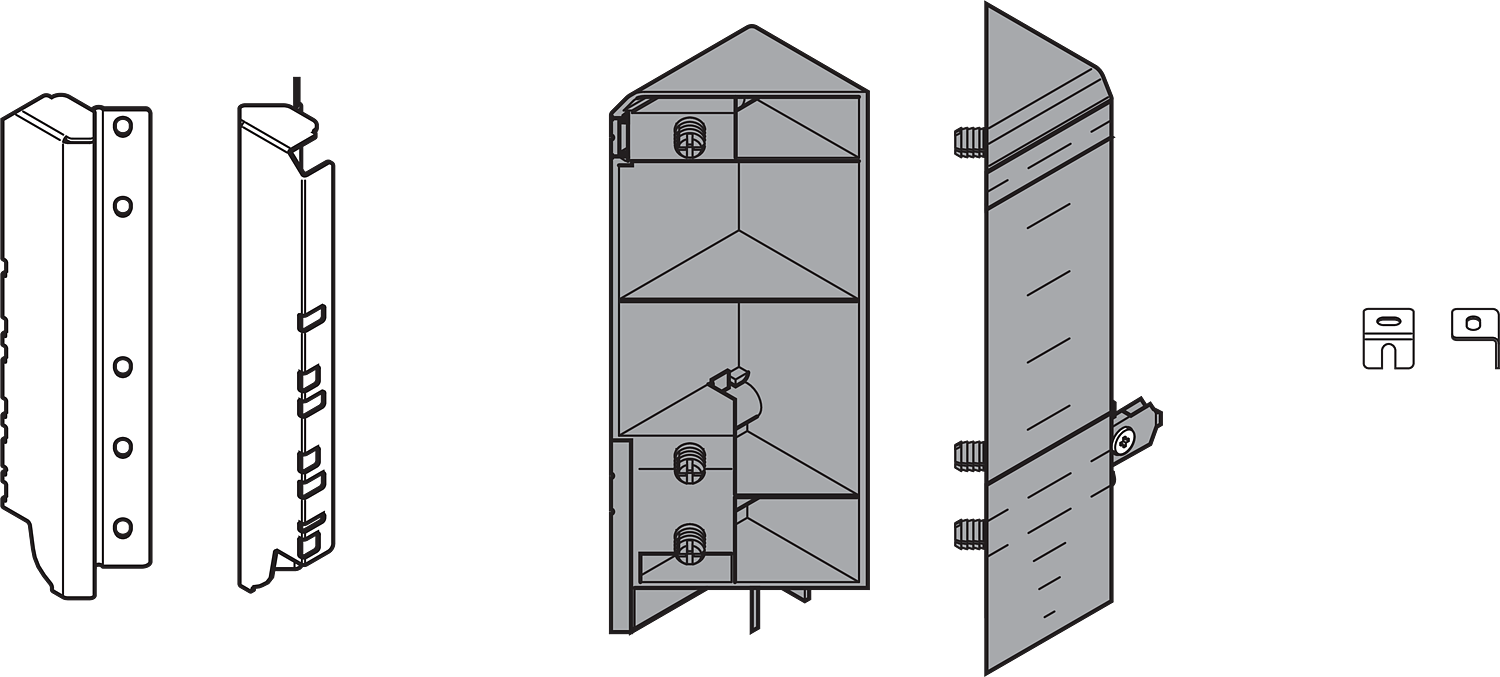 Sada čelního kování pro starší verzi rohové zásuvky SPACE CORNER se skosenými hranami čílek. Pro výšku zásuvky "D" (minimální světlost zásuvky na výšku 224mm). Sada obsahuje čelní kování pro Space Corner s nehybnými čílky, držáky zad a úhelníky.
