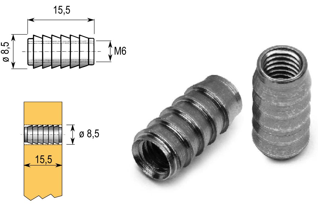 narážecí hmoždinka kovová, dlouhá 15,5 mm, M6, průměr 8,5 mm