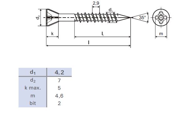 Drážka - Phillips (PH). Materiál - ocel kalená. Povrch - galvanický zinek. Šroubování do dřeva Pro správné připevnění desek CETRIS® ke konstrukcím je nezbytné dodržovat maximální rozteč nosné konstrukce a připevňujících prvků. Nejvhodnější pro přichycení desek CETRIS® jsou samořezné vruty s dvojchodým závitem, tvrzeným hrotem a zápustnou hlavou opatřenou břity pro zahloubení. Jako doplňkový materiál je možno dodat tento typ vrutů s obchodním označením CETRIS, průměr 4,2 mm, délka 35, 45, 55 mm pro spojování dvou desek CETRIS® v systému plovoucích podlah, nebo pro připevnění desek na vodorovné a svislé dřevěné konstrukce (podlahy, příčky, podhledy, apod.). Při kotvení by vrut do dřevěné konstrukce měl zasahovat minimálně ze 2/3 své délky, pro přichycení podlahových desek postačí užít vrut, jehož délka přesahuje o 20 mm tloušťku desky.