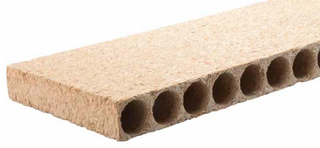 DTDS výtlačně lisovaná - vylehčená "Děrovaná". Typ RT 8 - díry průměr 28mm (60x); krajní díry 18mm (2x). Váha 520 Kg/m3. Použití jako výplň při výrobě plných dveří.