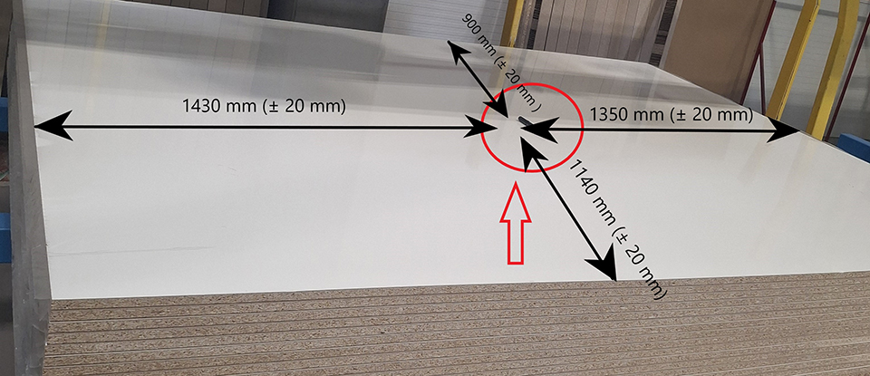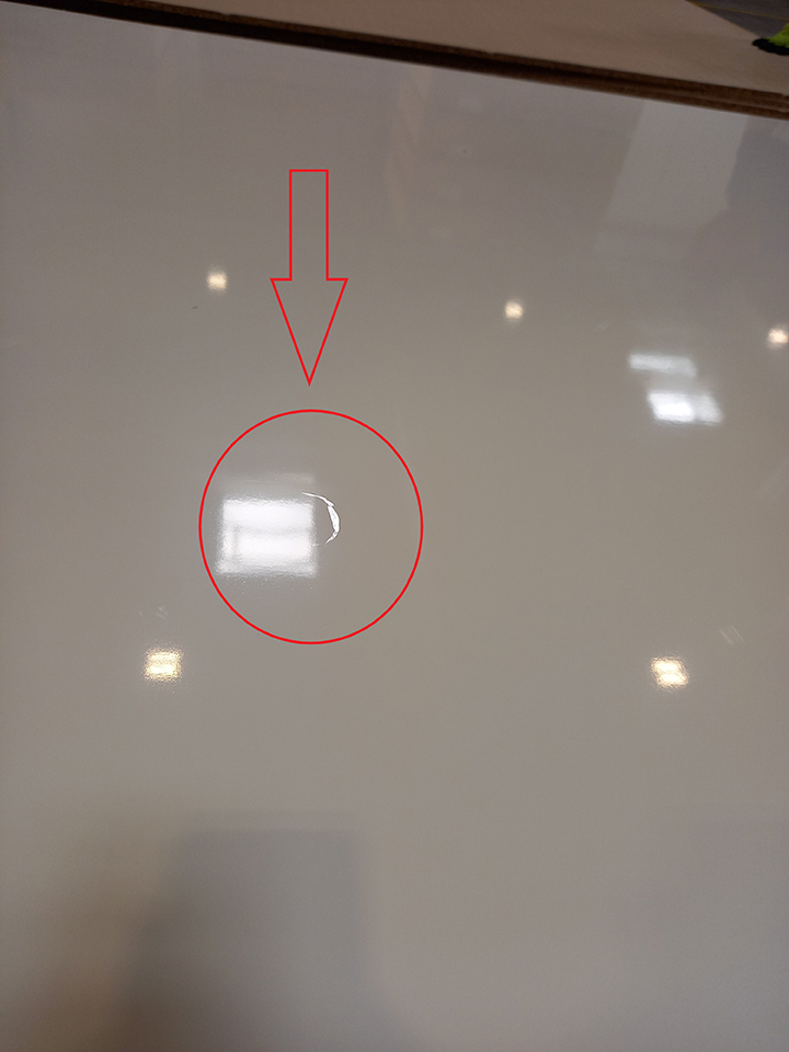 • Přibližně uprostřed desky se nachází vada – promáčknutí (cca 6 cm ve tvaru půlkruhu/kruhu)