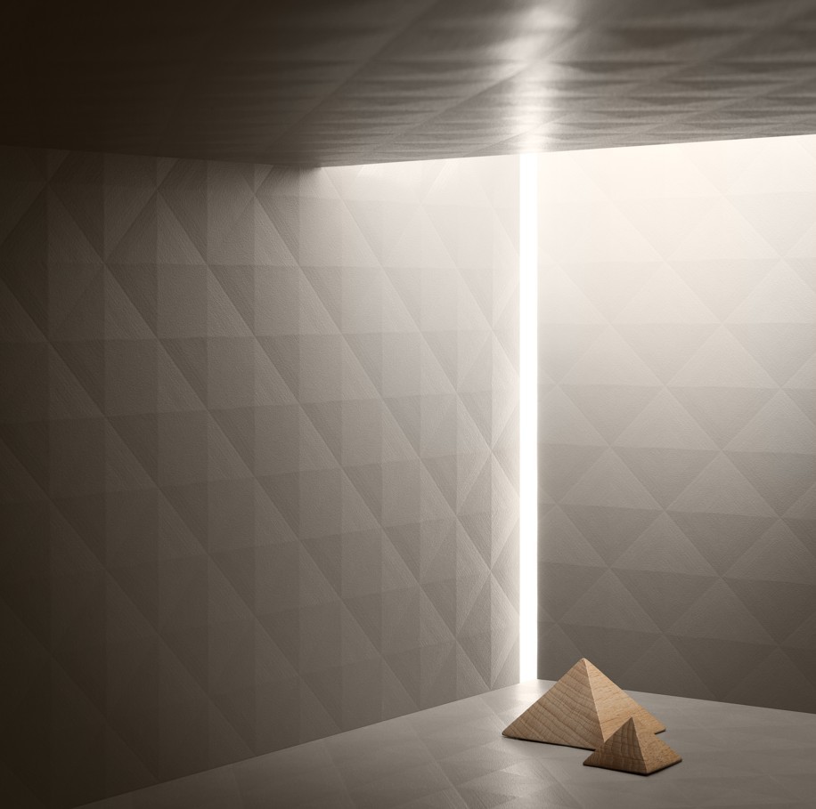 Tento dekor zaujme geometrickou strukturou s jemnými pyramidovými vzory, které vytvářejí poutavý světelný a stínový efekt.