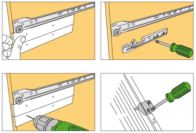 Externí tlumič s dotahem pro bílé výsuvy s bočnicí. Snadná montáž i do dříve namontovaných zásuvek. Sada obsahuje: tlumič, unašeč, vrtací šablonu a montážní vruty.