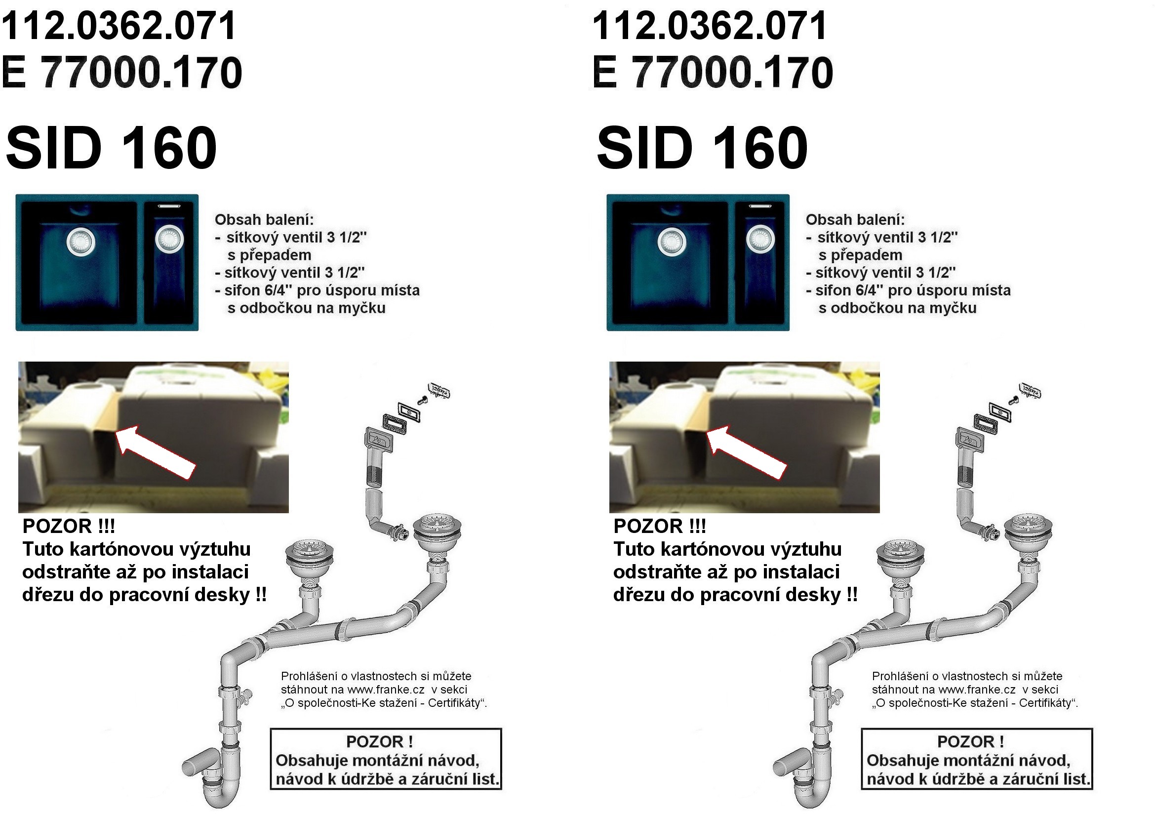 FRANKE dřez Tectonite SID 160 pro skříňku od 600 mm. rozměry: dřez s vaničkou 340 × 410 × 200 mm a 160 × 410 × 150 mm. Tectonitový dřez Sirius. Cena zahrnuje: Sítkový ventil 3 1/2“ s přepadem. Sítkový ventil 3 1/2“. Sifon pro úsporu místa 6/4“ s odbočkou na myčku nádobí.125.0363.804