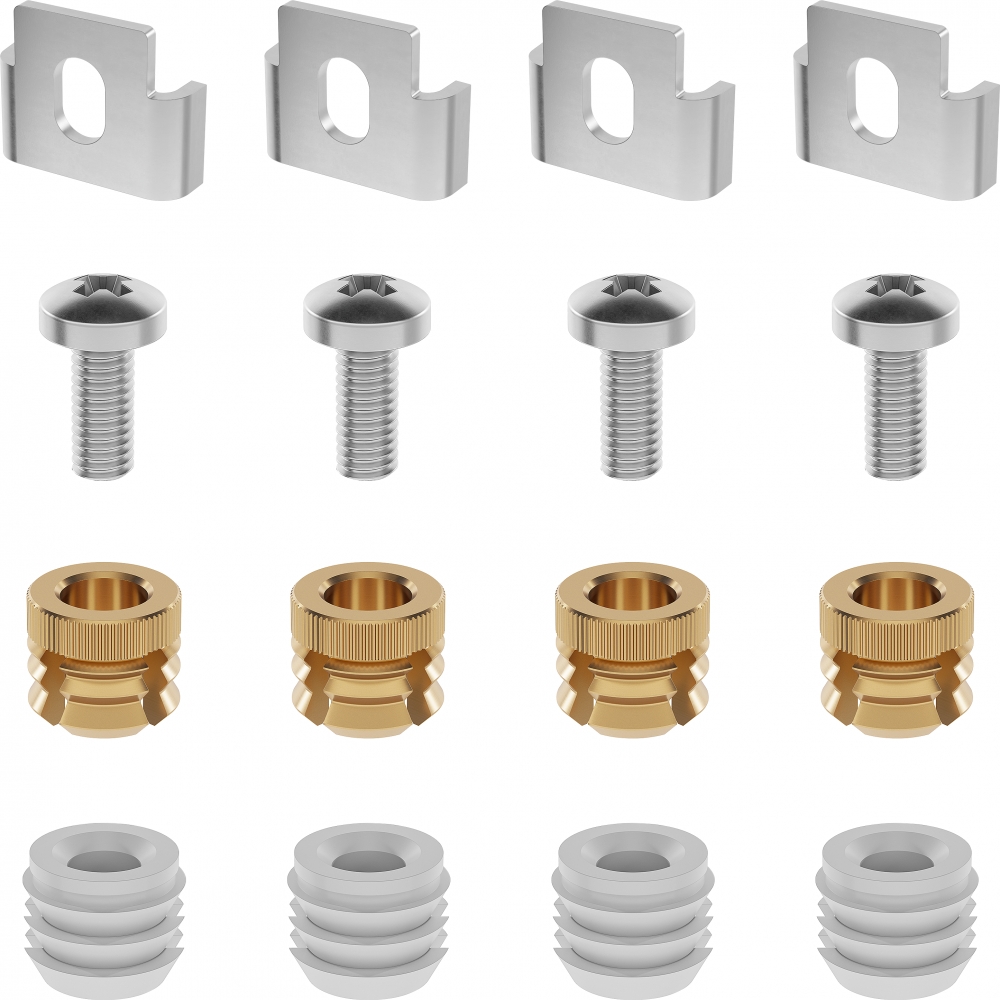 Balení obsahuje: 4× příchytku, 4× šroub, 4× mosazná rozpěrná matice a 4× plastová rozpěrná matice.