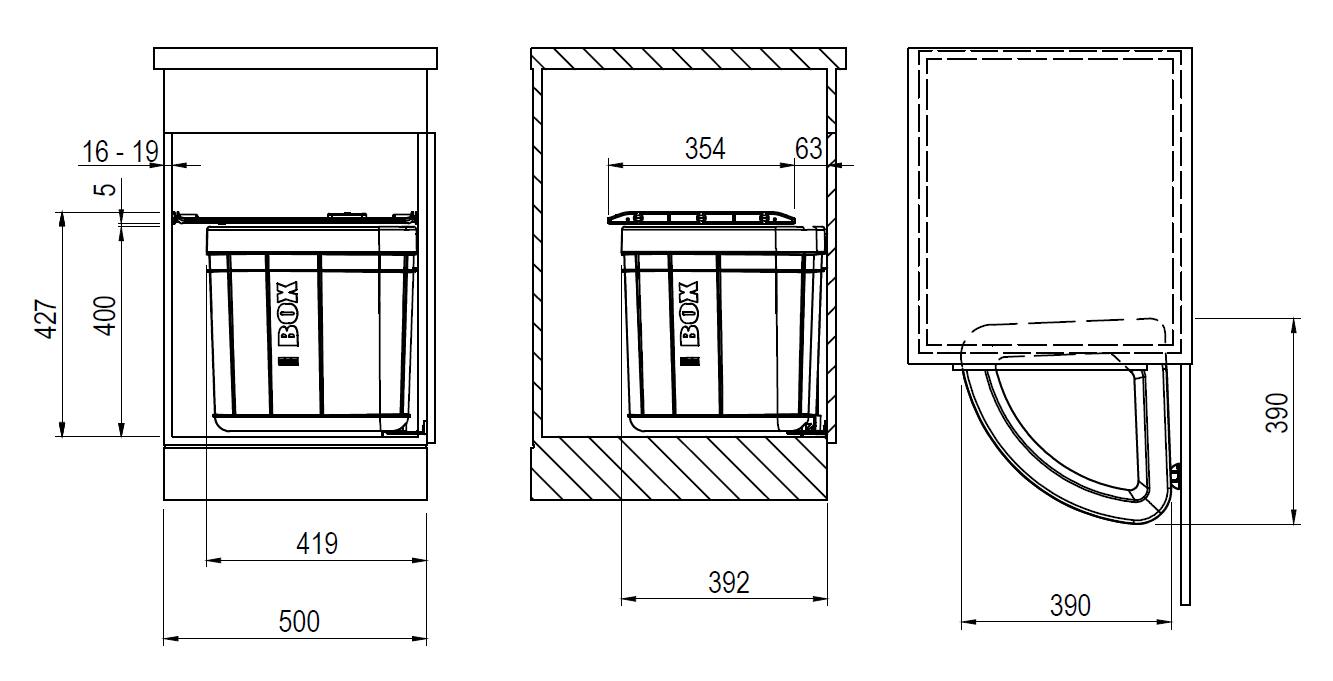 Upínací rám zajišťuje pevné uchycení sáčku (nebo 2 sáčků) a jeho/jejich snadnou výměnu a maximální využití objemu koše.