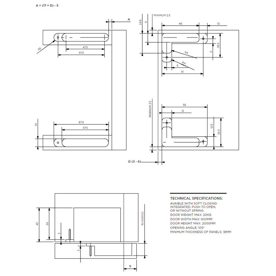 Verze s tlumeným dotahem. Dynamická zatížitelnost je 16kg na pár. Úhel otevření 105°. Možnost vrtání od kraje dveří K=3-6mm. Min tloušťka materiálu k zafrézování je 18mm.