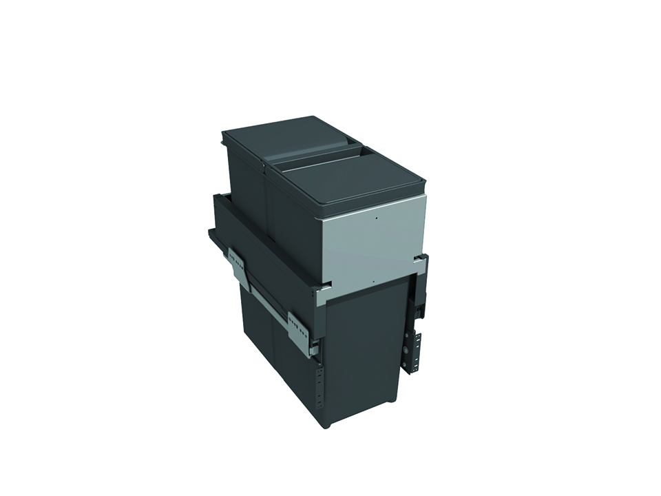 Sorter včetně celovýsuvů do skříňky 300 mm, obsahuje plastová víka košů, výška 506 mm, 1x koš 40L. Hloubka sorteru je 458mm, potřebná vnitřní hloubka korpusu je min. 462mm.