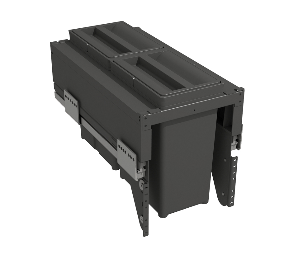 Sorter včetně celovýsuvů do skříňky 300 mm, obsahuje plastová víka košů, výška 298 mm, 2x koš 8l. Hloubka sorteru je 458mm, potřebná vnitřní hloubka korpusu je min. 462mm.