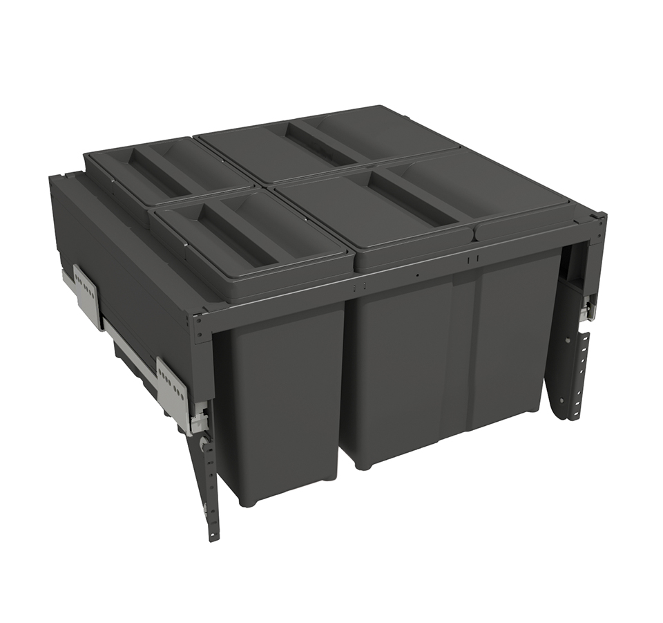 Sorter včetně celovýsuvů do skříňky 600 mm, obsahuje plastová víka košů, výška 298 mm, 2x koš 17l + 2x koš 8l. Hloubka sorteru je 458mm, potřebná vnitřní hloubka korpusu je min. 462mm.