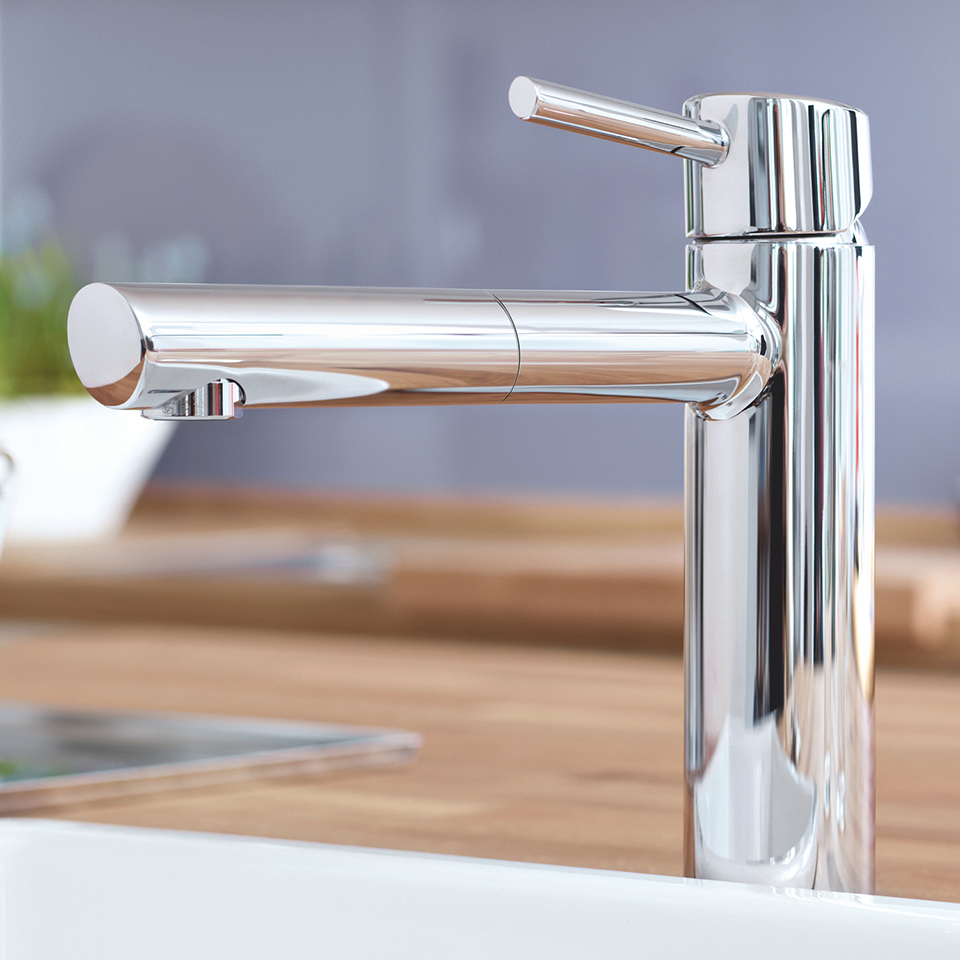 Tato kuchyňská baterie řady GROHE Concetto představuje dokonalou kombinaci praktičnosti a atraktivního designu. Její čisté linie a zářivá, chromová povrchová úprava GROHE StarLight atraktivnost podtrhuje. Baterie zahrnuje také praktickou, středně vysokou výpusť, kterou je možné hladce otáčet v rozsahu 100°. Definovaný rozsah otáčení brání narážení výpusti do okolních zdí nebo skříněk. Součástí baterie je navíc vytahovací sprchová hlavice, která je vhodná především pro vymývání hrnců a pánví, případně pro čištění dřezu. V srdci této baterie je technologie GROHE SilkMove, pomocí které je možné neustále plynule měnit objem tekoucí vody a její teplotu. Dokonalá kombinace.