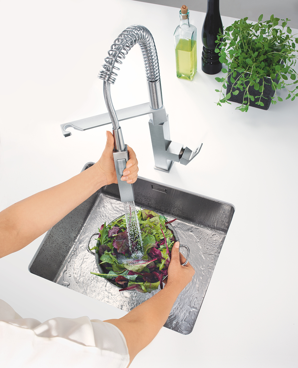 Kuchyňská baterie GROHE Eurocube Professional disponuje čistým, stylovým designem dokonalým do vaší moderní kuchyně a obsahuje všechny funkce, které by si aspirující domácí šéfkuchař mohl je přát. Obsahuje například profesionální vytahovací sprchu s 360° rozsahem otáčení, která navíc umožňuje stiskem jediného tlačítka přepínat mezi jemným a silným sprchováním, díky níž bude plnění a vyplachování vysokých hrnců hračkou. Integrovaná technologie GROHE SilkMove umožňuje plynulé a přesné ovládání proudu a teploty tekoucí vody. Úprava GROHE SuperSteel značí matný povrch z nerezové oceli, který vaší kuchyni dodá sofistikovaný, velice atraktivní nádech. Díky našemu snadnému instalačnímu systému vám navíc montáž zabere minimum času.