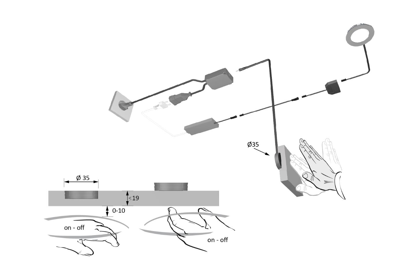 Do vyprodání zásob, náhrada - 536854 K-HAL MultiSwitch MagicSwitch podpovrchový vypínač včetně jednotky Master new. Dotykem plochy nad instalovaným vypínačem dojde k zapnutí / vypnutí osvělení (spotřebiče). Spínání spotřebičů až do maximálního příkonu 250 W, 230V AC (transformátory LED, osvětlení na 230 V nebo i jiné spotřebiče). Pro materiál tl. do 19 mm (pouze nekovové materiály). Nesmí být umístěno poblíž indukčních desek, transformátorů apod. Možnost zafrézování. Zapojení musí být provedeno výhradně podle návodu, je zakázáno zasahovat do instalace. Spotřeba v pohotovostním režimu: 0,5 W.