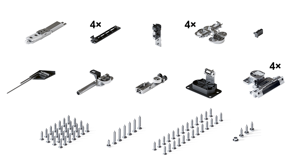 Hawa Folding Concepta III 25. Základní sada kování Push pro dvě křídla s otevíráním doprava i doleva, které je možno zasunout do kapsy. Nosnost 10 - 25kg. Šířka křídla 440 - 750mm. Výška křídla 1900 - 2700mm. Tloušťka materiálu 18 - 26mm.