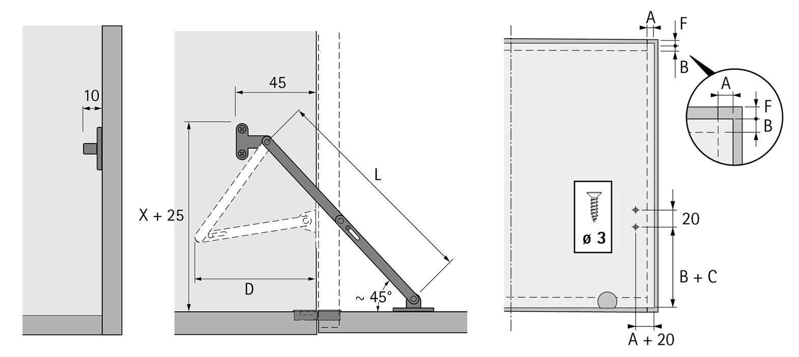 Sklopné kování 200mm pro dřevěná dvířka nebo dvířka s dřevěným rámem. Použitelné jednostranně nebo oboustranně (vlevo a/nebo vpravo). Světlá výška korpusu min. 165mm. Ocel niklovaná.