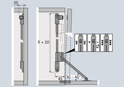 P-pravá brzda. Nosnost 4 kg na jednu brzdu. Světlá výška skříně 465 - 564 mm. Důležité: úhel mezi tažnou tyčí a otevřenými dvířky musí být 30 - 45 °. Při otevřených dvířkách musí tělo brzdy dosedat na spodní ložisko.