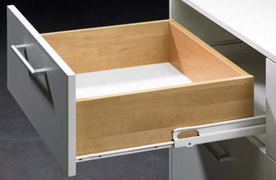 Plnovýsuv rolničkový pro dřevěné zásuvky s přesahem, naložená montáž, integrovaná samozavírací technika, pojistka proti vypadnutí a aretovatelná teleskopická středová kolejnička.