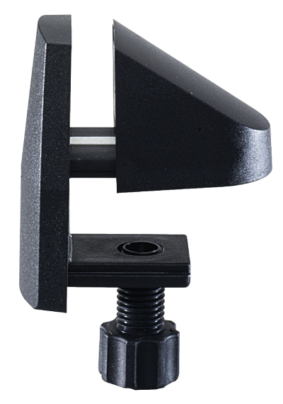 Držák krycí desky, upevnění svěrkou, pro tloušťku stolové desky 15 - 34 mm a stěny 2 - 28 mm. Plast černý.
