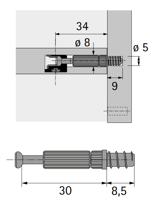 Kolík k zašroubování Twistr/pouzdra pro Rastex 15, eurozávit pro průměr vrtání 5 mm, upínací rozměr 30 mm, délka závitu do korpusu 8,5 mm, ocel pozinkovaná, plast černý.