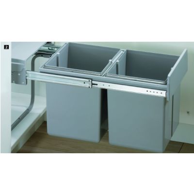 Pro šířku skříňky min.400 mm. Montáž na dno korpusu. Systém s plnovýsuvem. Šířka 338 mm, hloubka 485 mm, výška 385 mm. Sada obsahuje: 2 nádoby 20 L, kompletní kování s plnovýsuvem a víkem korpusu. Nádoba nerezová ocel, víko plast černý.