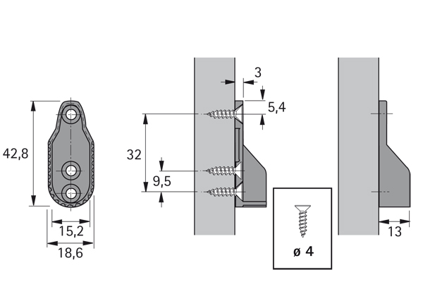 K našroubování se 3 otvory na vruty, rozteč otvorů 32 mm, poniklovaný zinkový odlitek.