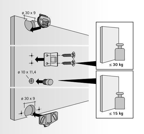 Pro hmotnost dveří max.30 kg. U skříně se 2 křídly je třeba 1 distanční díl. Ocel pozinkovaná.