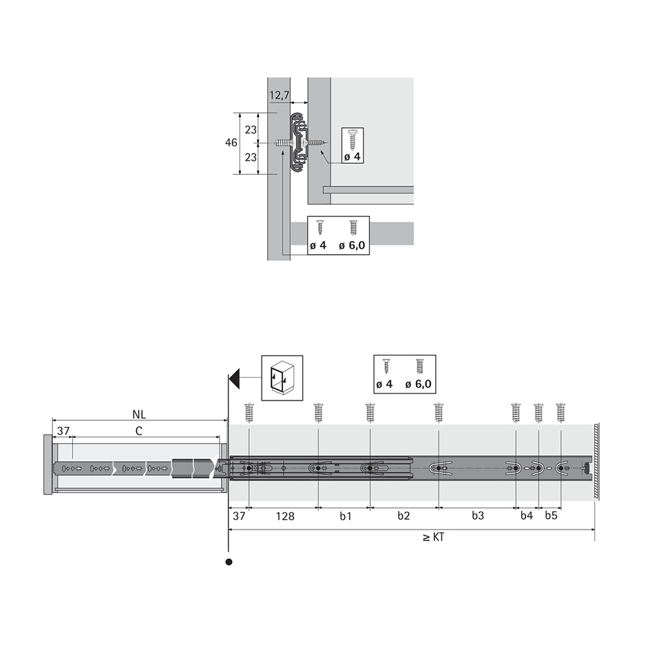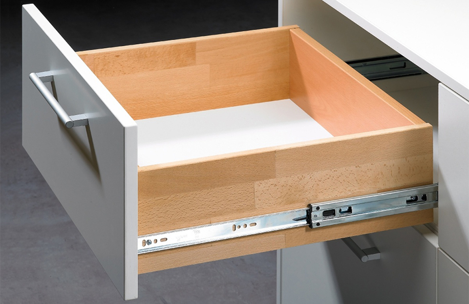 Plnovýsuv pro dřevěné zásuvky kuličkový, montážní šířka 12,7 mm, nosnost 45 kg. Se zarážkou a pojistkou proti nechtěnému vysunutí. Pomocí páčky lze výsuv rozdělit a zásuvku tak jednoduše vyjmout z korpusu. Pro zásuvky s dnem v drážce, polodrážce nebo na tupo. Ocel. Barva černá
