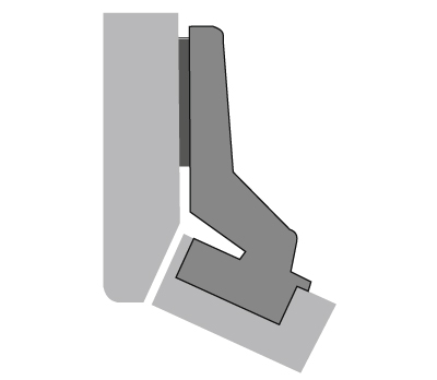Klipový miskový závěs vložený pro rohové a úhlové skříně s korpusovým úhlem 30°, úhel otevření 95°, tloušťka dveří od 16 mm, průměr misky 35 mm, s pružinou. Doporučené podložky: D3 vrut 118057; D3 euro 154410.