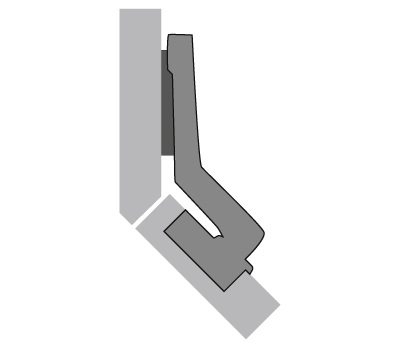 Klipový miskový závěs vložený pro rohové a úhlové skříně s korpusovým úhlem 45°, úhel otevření 95°, tloušťka dveří od 16 mm, průměr misky 35 mm, s pružinou. Doporučené podložky: D3 vrut 118057; D3 euro 154410.