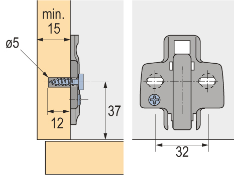 Montážní podložka pro závěsy Sensys a Intermat Hettich Top s excentrickým seřízením výšky +- 2 mm. Tloušťka boku od 15 mm. Rozteč otvorů 32 mm. S předmontovanými speciálními vruty a plastovými pouzdry pro vrtání d=5x12 mm. Ocel niklovaná.