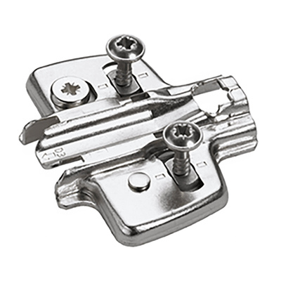 Montážní podložka Hettich Top pro závěsy Sensys a Intermat pro bok korpusu. Tloušťka boku od 15 mm. Rozteč otvorů 32 mm. S předmontovanými vruty. Excentrické seřízení výšky ± 2 mm. Ocel niklovaná.