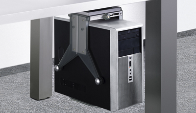 K našroubování pod stolovou desku. Stavitelná šířka, výška a hloubka. Otočné o 360°. Rozměry skříně počítače: výška 363 - 623 mm šířka 210 - 298 mm Plast průsvitný.