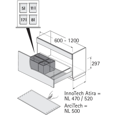 Ke vložení do zásuvky InnoTech, jmenovitá délka 470 nebo 520 mm. Pro šířku skříňky 600 - 1200 mm. Kapacita 41 litrů. Rohož lze seříznout. Montážní výška 297 mm. Sada obsahuje: 4 nádoby s víkem - 1x17 l + 1x11l, + 1x8l, + 1x5l, 1 rohož. Zásuvka InnoTech se objednává samostatně.