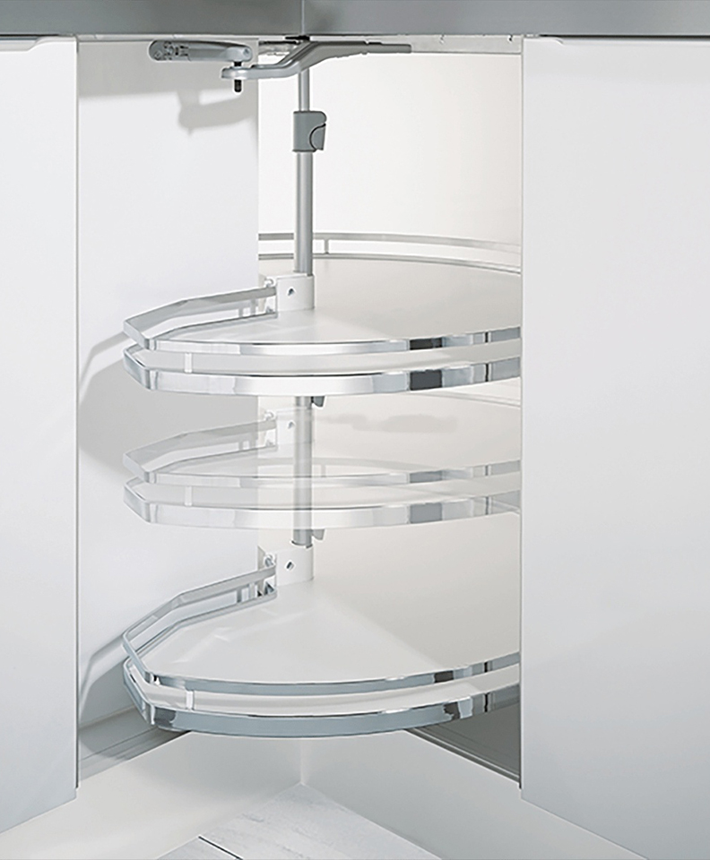 Otočné kování rohové dolní skříně se skládanými dveřmi. Pro rozměry korpusu 800x800 a 900x900 mm. S integrovaným tlumením Silent System. Pro světlé výšky skříněk 660 - 860 mm. Není nutné uchycení na půdu. S rychlomontážním systémem ClickFixx. Police se objednávají samostatně.