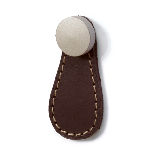 Kožená úchytka GALATI (kapka) kůže tmavá hnědá. Doobjednat krytku se speciálním montážním šroubem ( 136584 chrom mat, 187689 chrom, 187690 nikl mat, 187691 bronz antik ).