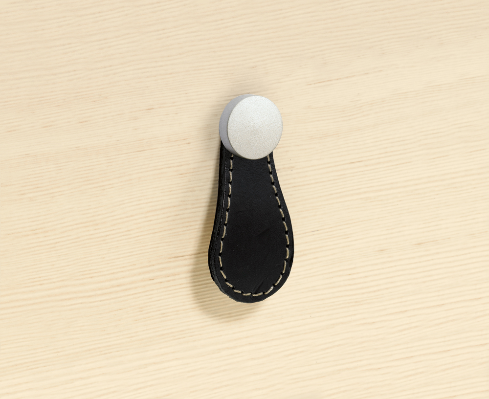 Kožená úchytka GALATI (kapka) kůže černá. Doobjednat krytku se speciálním montážním šroubem (376385 chrom mat, 187689 chrom, 187690 nikl mat, 187691 bronz antik ).