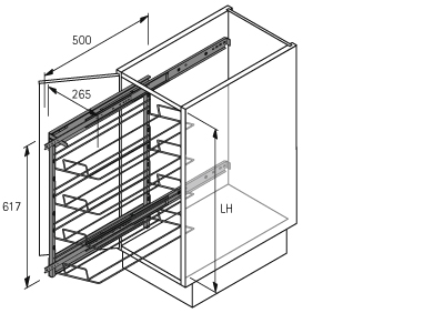 Pro montáž na bok korpusu. Kuličkový výsuv s tlumením Silent System. Se 4 závěsnými policemi. Lze použít jako levý nebo pravý. Ocel, prášková barva stříbrná. Sada obsahuje: 1 ks výsuvný rám, 4 ks police na boty.