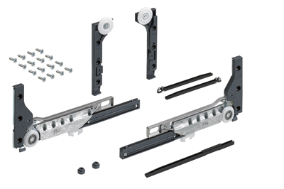 Sada kování pro tlumené dveře (tlumení ve směru zavírání, otevírání i kolize), 30 kg, minimální šířka dveří: 450. Sada obsahuje všechny díly potřebné pro1 dřevěné posuvné dveře s tlumením.