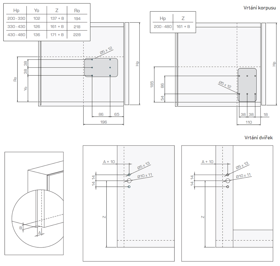 K přišroubování na bok korpusu, vpravo nebo vlevo. Horizontální a vertikální použití v závislosti na prostoru. Výklopná dvířka musí být dole osazena miskovými závěsy nebo závěsy pro sklopná dvířka (objednejte zvlášť). Krytky je třeba objednat zvlášť.