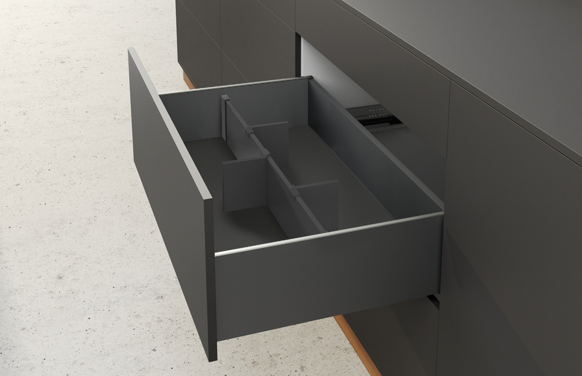 OrgaStore 830 sada, 600, antracitová. Číslo artiklu 9230256. Systém profilů s podélnými dělicími prvky pro vysoké zásuvky a vnitřní vysoké zásuvky. Lze použít v zásuvkách AvanTech YOU jmenovité délky od 300 mm. Sady jsou určeny pro standardní šířky korpusu a tloušťku boku korpusu 16 - 19 mm. Doporučujeme použít protiskluzovou podložku. Sada obsahuje: 1 ks hliníkový profil s plastovými adaptéry Plastové dělicí prvky, množství viz obrázek